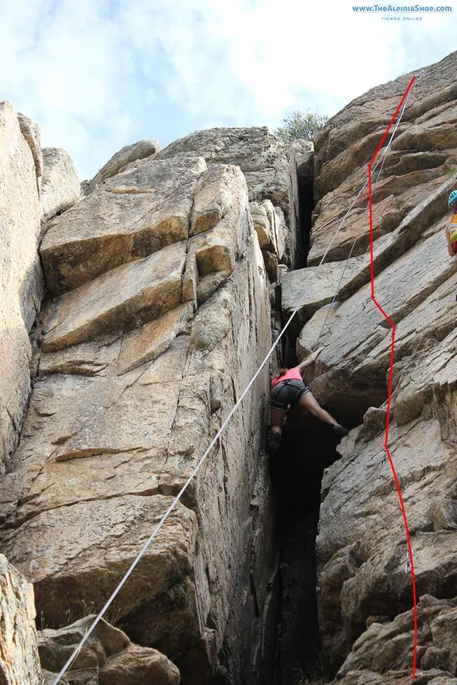 En la foto, tomada en una popular escuela de escalada madrileña podemos ver como el escalador se ha salido del trazado de la vía (marcado en rojo), la lógica nos dice que en caso de caída descontrolada nada evitará que vaya directo al canalizo sobre el que está escalando, podría evitarse guiando la cuerda por las exprés.