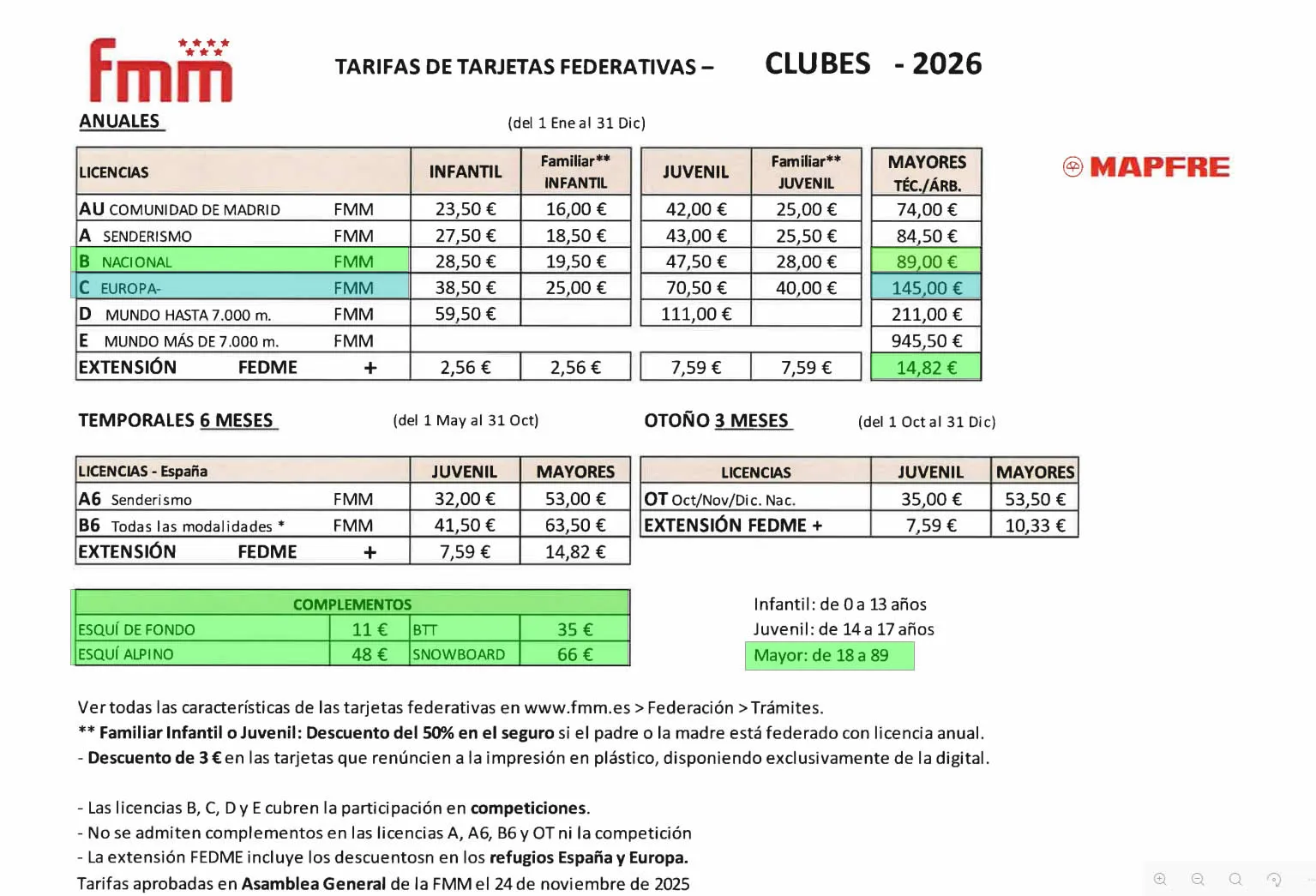 Tarifas de licencias federativas 2026 (FMM). (Añadir a estos precios 10€ de la cuota del Club Monval 2026)