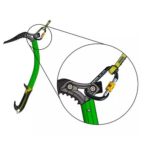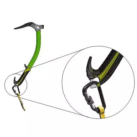 · Es súper ligera (94 g.) y muy cómoda, ideal para escalada en hielo o para travesías por glaciares. · Está fabricada en un 85% de PAD, 0.5% PES, 14.5% fibras elásticas. · Los mosquetones son de aleación ligera de aluminio. · Tiene una resistencia de 3 kN (300 kg). ¡No está indicado para usarse como absorbedor de energía! · Esta dragonera bífida para asegurar piolets tiene forma de V, formada por dos cintas que terminan uniéndose en un anillo textil que permite atar la correa al anillo ventral del arnés. La correa se ata al arnés de una forma cómoda y segura, haciendo un nudo de cabeza de alondra. · La longitud de la correa elástica Bungee se extiende de 64 a 136 cm (incluidos los mosquetones) y permite una gran libertad de movimientos. · Los dos mosquetones mini con cierre de rosca de la correa Bungee tienen una apertura de cierre de 12 mm y pueden mosquetonearse a la cabeza o al regatón del piolet, dependiendo del uso que queramos darle en cada momento. Modo de empleo: si estamos usando el piolet como apoyo en una progresión, el mosquetón de la Bungee debe asegurarse al orificio de la cabeza del piolet. En cambio, si estamos usando el piolet tracción en terrenos más empinados y lo empuñamos por la parte baja, mosquetonearemos la correa al orificio del regatón. (Parte inferior del piolet)