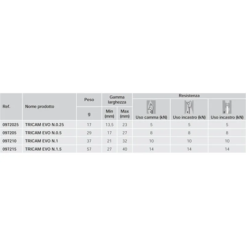 El Tricam Evo de Camp; la lógica evolución del aclamado Tricam tradicional. Toda la evolución se encuentra en algunos detalles oportunamente modificados, que permiten ahora una segunda modalidad de posicionamiento como bloqueo pasivo.