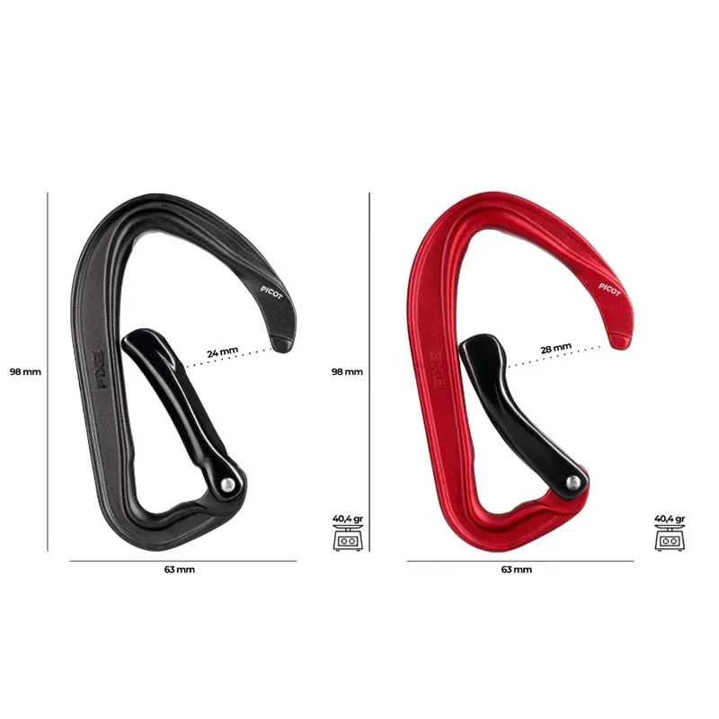 MOSQUETONEAR ES MÁS PRECISO Y ÁGIL QUE NUNCA · Rango de apertura excepcional: Con un gatillo forjado en caliente, el Picot Curve facilita la inserción de la cuerda y ofrece un rango de apertura excepcional de 28 mm. · Geometría optimizada: Se ha reducido el material a lo esencial, manteniendo solo los puntos clave para maximizar su ergonomía y garantizar un excelente contacto con la cuerda y la chapa con un peso de solo 40,4 g. · Facilita la apertura: Con un gatillo forjado en caliente, el Picot Straight proporciona una gran superficie de contacto con el pulgar, facilitando su apertura. · Alarga la vida del conjunto: Con un ancho de 11 mm, genera un mayor radio de curvatura de la cuerda sobre el mosquetón, reduciendo su desgaste y alargando la vida útil tanto de la cuerda como del mosquetón. · Snagfree: La parte inferior de su nariz está suavizada para facilitar la maniobra de desmosquetonear la chapa y la cuerda. · Conical Nose: Su nariz puntiaguda, de forma cónica, facilita la inserción del mosquetón en chapas u otros puntos de conexión de forma precisa y fluida, sin obstáculos. A su vez, facilita la salida durante el desmontaje. · Keylock: Evita enganchones con la cuerda o la chapa durante el mosquetoneo. · Doble verruga antirotación: Presente en el mosquetón de la chapa, con una protuberancia en el cuerpo y otra en el gatillo, reduce la posibilidad de que el mosquetón gire y de que la cinta se deslice a través del mosquetón, manteniéndolo siempre bien posicionado. · Resistencia: Con valores de 22 kN cerrado, 8 kN en transversal y 8 kN con el gatillo abierto. Cumple con la norma EN 12275.