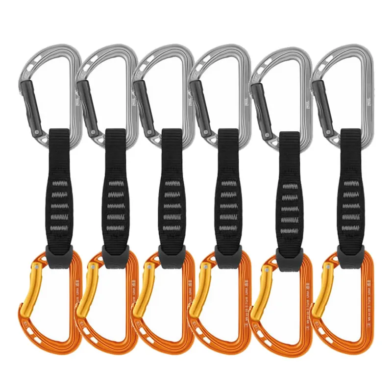 Facilidad de mosquetoneo y desmosquetoneo: - Mosquetones con sistema Keylock diseñado para evitar los enganches accidentales en el anillo portamaterial, el anclaje o la cuerda. - Mosquetoneo/desmosquetoneo más fáciles, gracias al diseño del gatillo recto que proporciona un excelente agarre. - Gatillo curvo que permite mosquetonear la cuerda eficazmente. - Dorso del mosquetón plano que proporciona una excelente estabilidad en la mano o en los mosquetoneos en pinza. - Protector de cinta STRING que permite estabilizar el mosquetón durante el mosquetoneo. - Cinta cosida EXPRESS ergonómica que ofrece una excelente sujeción en mano.
