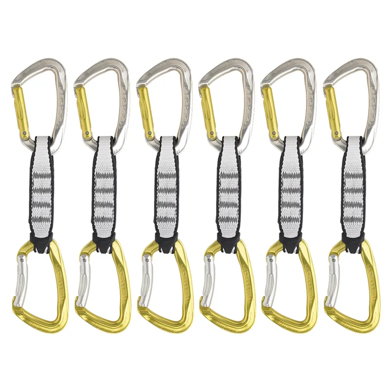El pack Eleven. el juego de cintas exprés más resistente, está hecho específicamente para la escalada deportiva. La carga de rotura con el gatilo abierto de 11 kN y un gran diámetro permiten una caída segura y sin miedo. Viene con la cinta exprés-TANGA, una protección de cincha que mantiene el mosquetón que lleva la cuerda en su lugar, y una correa de poliamida extra ancha.