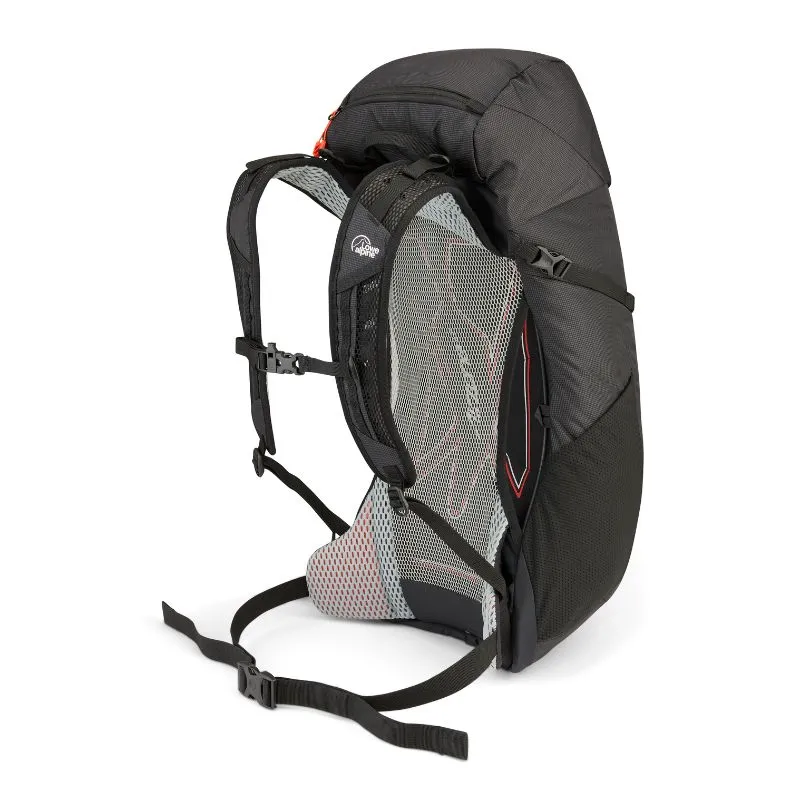 · Incorpora el sistema trasero AirZone™ LT, una espalda de malla suspendida ultraligera que se adapta al contorno del cuerpo y crea un canal de ventilación permanente entre la mochila y la espalda. Este sistema se combina con una placa rígida anti-barril, que mantiene la forma de la carga y mejora la estabilidad, permitiendo una distribución equilibrada del peso y una excelente transpiración incluso durante caminatas exigentes.