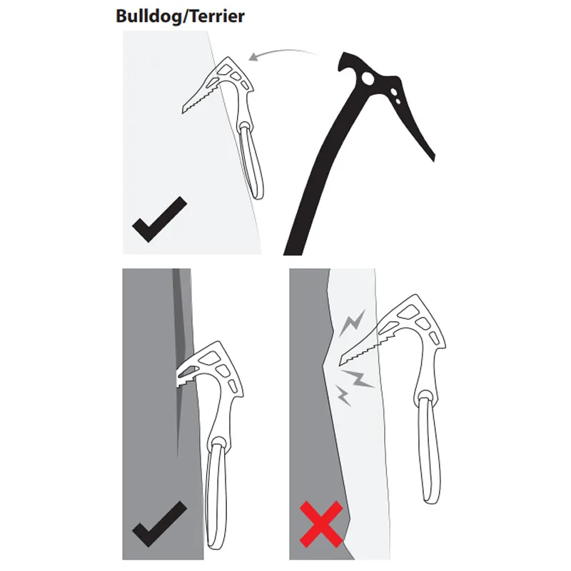 La protección en las escaladas invernales suele ser limitada, lo que te obliga a aprovechar al máximo cualquier opción disponible. El Bulldog se puede utilizar en muchas situaciones en escalada invernal. Principalmente es un anclaje que encuentra ubicaciones sólidas en césped congelado y barro, también se puede colocar gancheando los agujeros en hielo dejados por los piolets, e incluso se puede clavar en grietas y fisuras como una clavija. Una placa larga y plana en la parte posterior del Bulldog crea una buena área para martillear, lo que hace que las colocaciones sean rápidas y fáciles. Un mango largo le permite crear palanca para extraer fácilmente el Bulldog de ubicaciones difíciles y también incluye una eslinga extensible de Dyneema que ayuda a reducir la fricción de la cuerda en actividades invernales sin una trayectoria recta. El perfil se asemeja a un pico de piolet, con dientes orientados hacia atrás que ayudan al Bulldog a morder el césped y las grietas heladas cuando se carga. El Bulldog alcanza 15 kN en pruebas de laboratorio y, cuando se coloca correctamente, brinda seguridad en un entorno inseguro