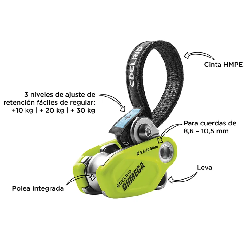Transformando el aseguramiento: el compacto y ligero OHMEGA, con un peso de apenas 190 g, es un asistente de frenado con una versátil gama de aplicaciones y dirigido a un amplio público. Supone un verdadero valor añadido en términos de seguridad y comodidad, tanto para la persona que escala como para la que asegura, en rocódromo, en montaña, así como en rutas de escalada deportiva alpina (con cuerda simple). Esto beneficia a escaladores y escaladoras principiantes, con experiencia y profesionales, así como a cordadas con y sin diferencias de peso. La cinta de HMPE integrada permite ajustar tres niveles de frenado con un solo movimiento, en función de la distribución del peso.