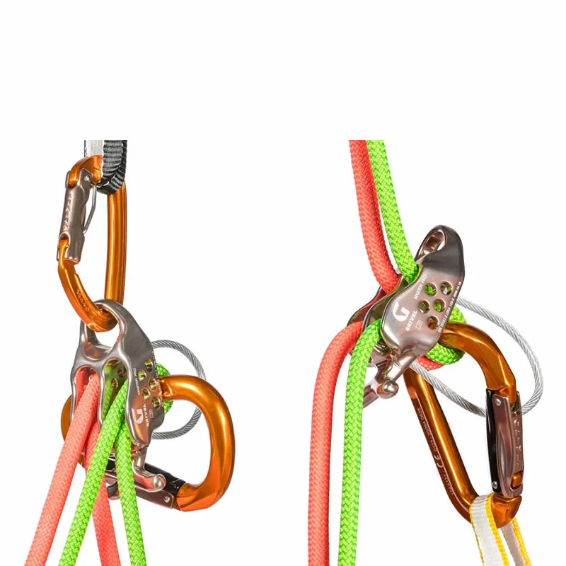 Master Pro fue creado para asegurar y hacer rappel. Es una herramienta versátil, dinámica y confiable para minimizar la fuerza transmitida a los anclajes, el aseguramiento y el desgaste con el tiempo de la cuerda. También se puede utilizar en modo guía como placa autobloqueante, para asegurar un segundo. Los dos "cuernos" que se colocan en uno de los dos extremos tienen dos funciones principales: