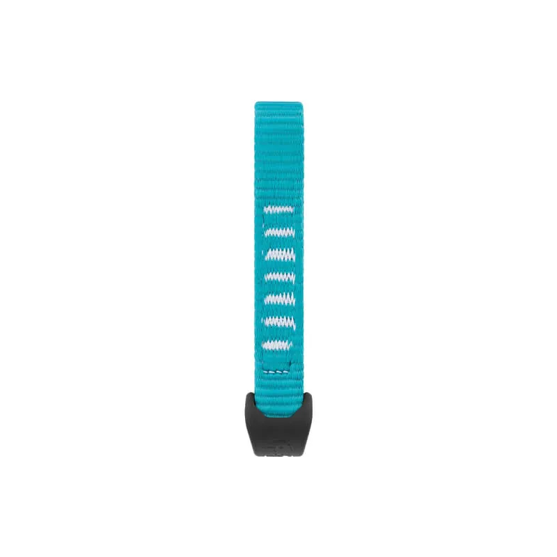 Características: Materiales: poliéster y caucho. Certificaciones: CE EN 566 y UIAA Longitud de la cinta: 12 cm Resistencia: 22 kN Peso: 16 g